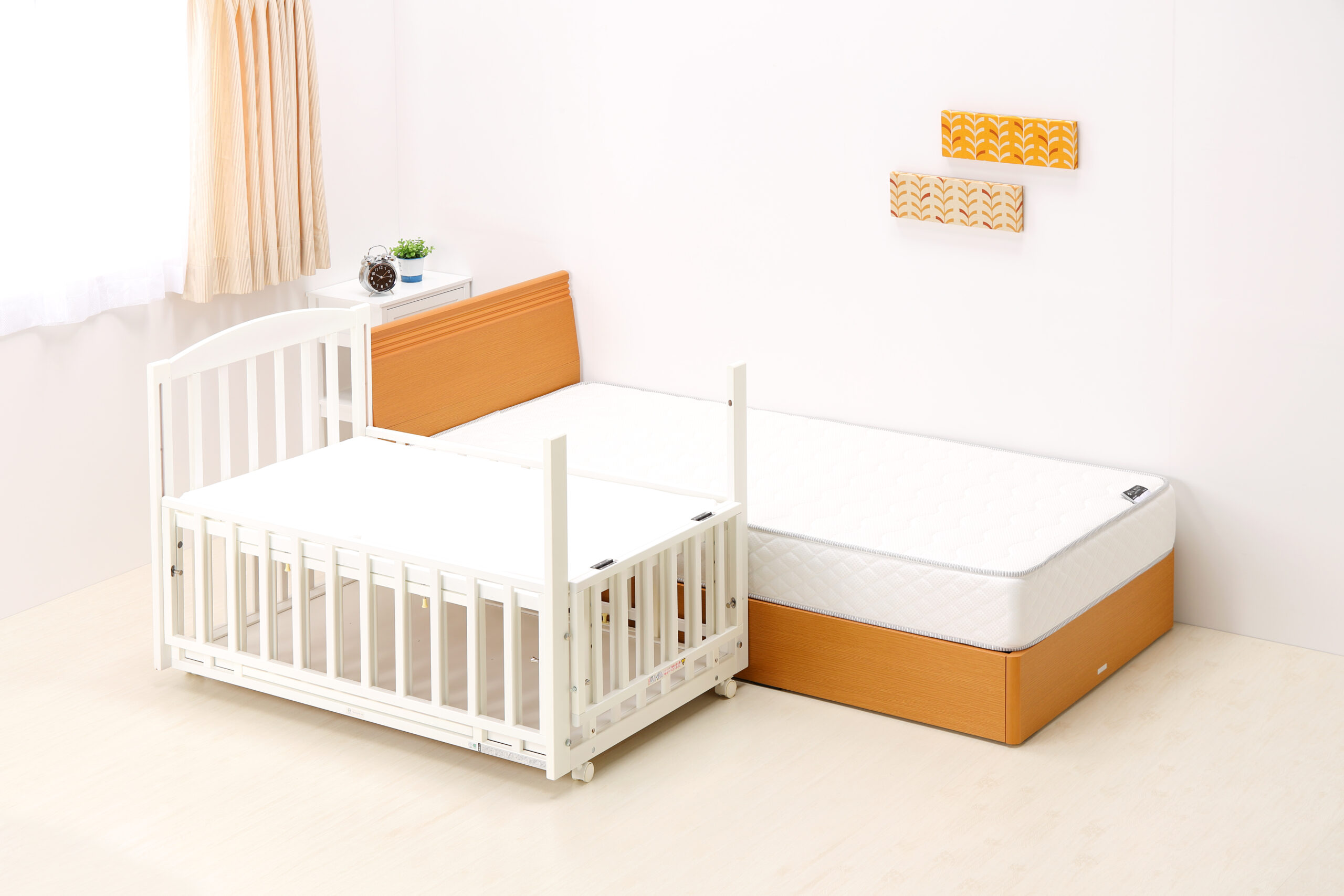 赤ちゃんとの添い寝に最適な「スリーオープンベッド b-side DX」が登場!両面スライド開閉で、使い方がさらに便利に進化しました。ママのベッドと高さを合わせて設計され、床板は45・40cmに調節可能。寝かしつけや抱き上げがスムーズで、足元側の枠は倒れてオムツ交換も楽々。後枠には収納扉も付いており、赤ちゃん用品の出し入れも簡単です。赤ちゃんとの快適な夜をサポートします!