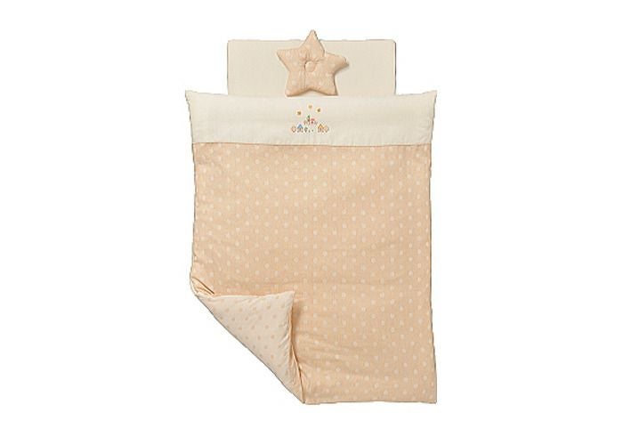 掛け布団、枕の側地、フィットシーツはオーガニックコットン(有機栽培綿)を原料とする素材を使っているので、肌の弱いお子様にも安心して使っていただけます。枕はお星さまのイメージ!